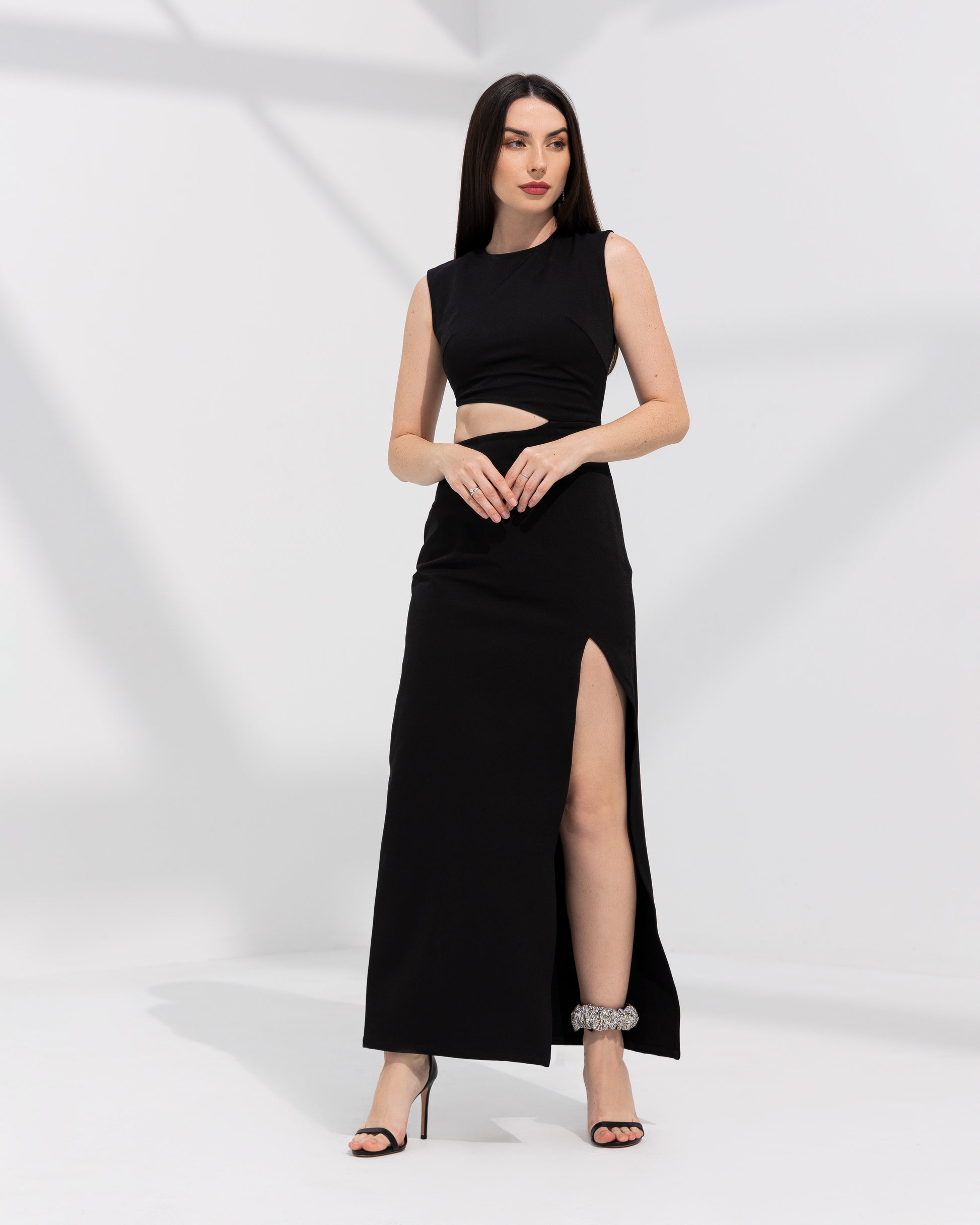 The Onyx Nightfall Dress is a breathtaking addition to your wardrobe. This versatile black dress is crafted from an elastic and stretchy fabric, providing both style and comfort. The alluring side cutout and thigh-high slit are perfect for making a statement, whether you're attending a special event or a night out on the town.