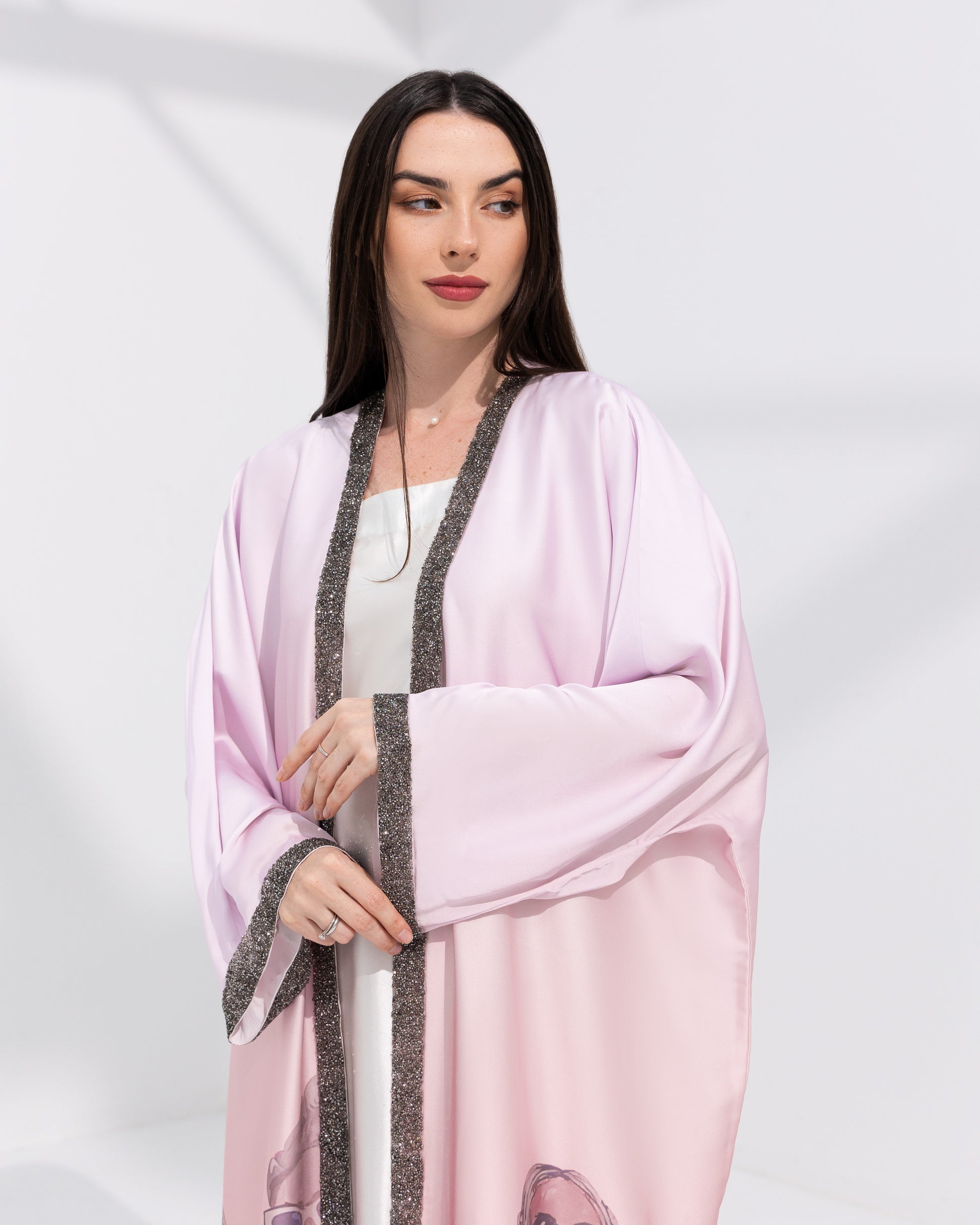 Step into Ramadan with a touch of whimsy and elegance in our 'Pink Portrait Abaya' This vibrant pink abaya invites you to express your unique style while embracing the sacred traditions of Ramadan with confidence and grace.